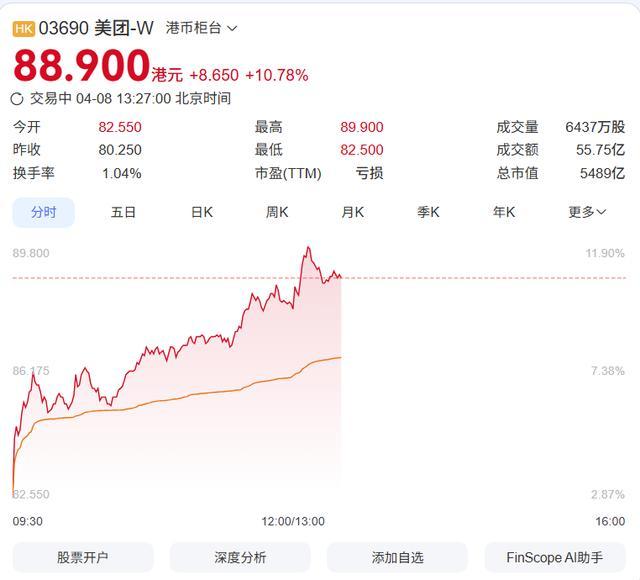 4月8日音讯,好意思团港股午间大涨10.78%,竣事发稿,