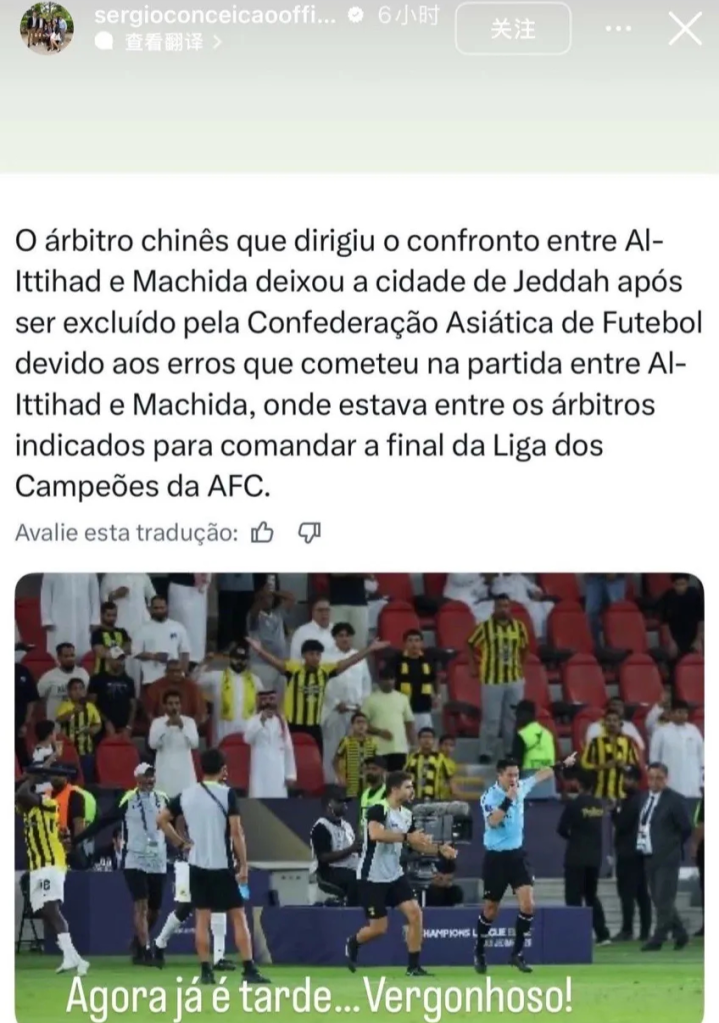 值得把稳的是,吉达长入主帅孔塞桑,在个东说念主应答媒体上还转发了马宁为止亚冠司法任务的新闻,这位前米兰主帅懊恼评述说念:“当今处分他仍是太晚了,果然可耻!”