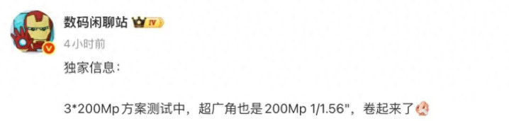今天,博主@数码闲聊站 的一份爆料中提到“3*200Mp决策测试中,超广角亦然200Mp 1/1.56",卷起来了”。