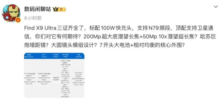 音信披露,一款型号为 PMA110 的 OPPO 新机通过了 3C 认证,其中莫得详备的家具系列信息,但博主@数码闲聊站 说明其等于全新的Find X9 Ultra,开云体育且这款新机仍是三证王人全了。