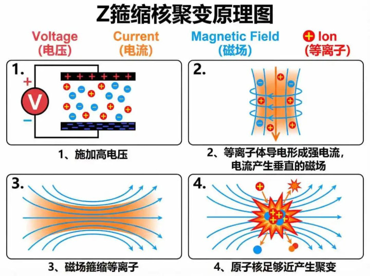 简便来说,便是给一个燃料棒通上一股超等雄壮的电流,电流产生的高温会把燃料棒变成等离子体,而电流产生的超等磁场,则会把等离子体压缩到一个极小的空间内,这时候核聚变就会发生。