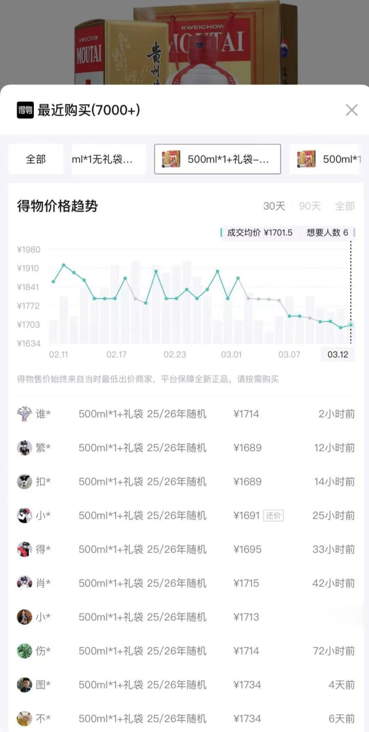 得物App数据露出,1月下旬以来,飞天茅台53度500ml价钱呈现高潮态势,30日成交均价为1739元/瓶,且在1月31日高潮到1813元/瓶的高点;春节前夜的成交均价约1789元/瓶,而后开动回落。3月12日,界面新闻查询该平台,数据露出飞天茅台53度500ml成交均价为1714元/瓶。