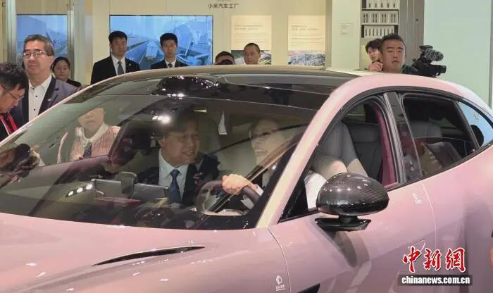 4月12日,中国国民党主席郑丽文(左一)在北京参不雅小米汽车工场。 中新社记者 路梅 摄