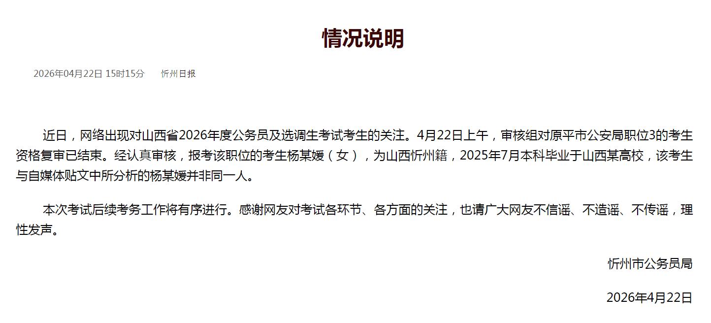 近日,汇注出现对山西省2026年度公事员及选调生老师考生的关切。4月22日上昼,审核组对原平市公安局职位3的考生履历复审已边界。经郑重审核,报考该职位的考生杨某媛(女),为山西忻州籍,开云体育app官方最新版2025年7月本科毕业于山西某高校,该考生与自媒怜惜文中所分析的杨某媛并非消除东说念主。