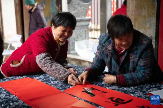 2月6日,在安徽省黄山市黟县南屏村,村民干预写对联活动。