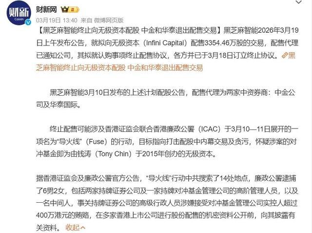 然则,开云体育这笔融资很快出现波折。就在配售公揭发布后不久,香港证监会与廉政公署启动代号为“引火线”的聚集法则动作,针对配股内幕来回及行贿步履伸开走访。阛阓音信自大,被走访机构波及蒙胧老本等联系主体。随后,蓝本担任配售代理的中金公司与华泰国皮毛继见告断绝配售公约,黑芝麻智能随后公告断绝配售代理安排,但保留与蒙胧老本的认购公约,并示意将径直鼓吹认购事项。