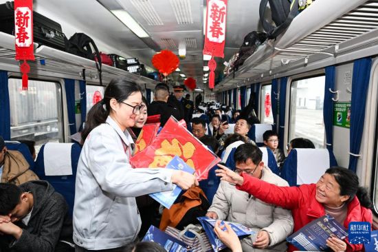 2月5日,招聘企业代表在K8362次列车上向游客披发招聘传单。