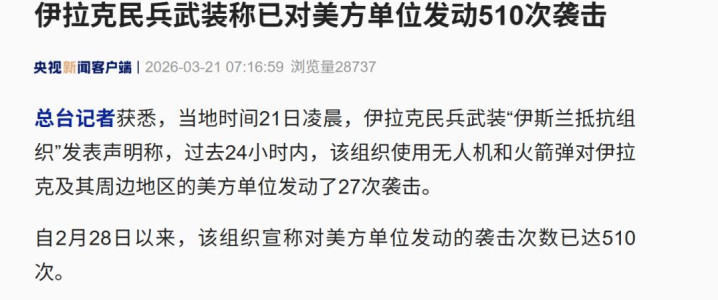 总台记者获悉,当地时分21日凌晨,伊拉克民兵武装“伊斯兰违反组织”发表声明称,昔时24小时内,该组织使用无东谈主机和火箭弹对伊拉克相配附进地区的好意思地契元发动了27次首要。